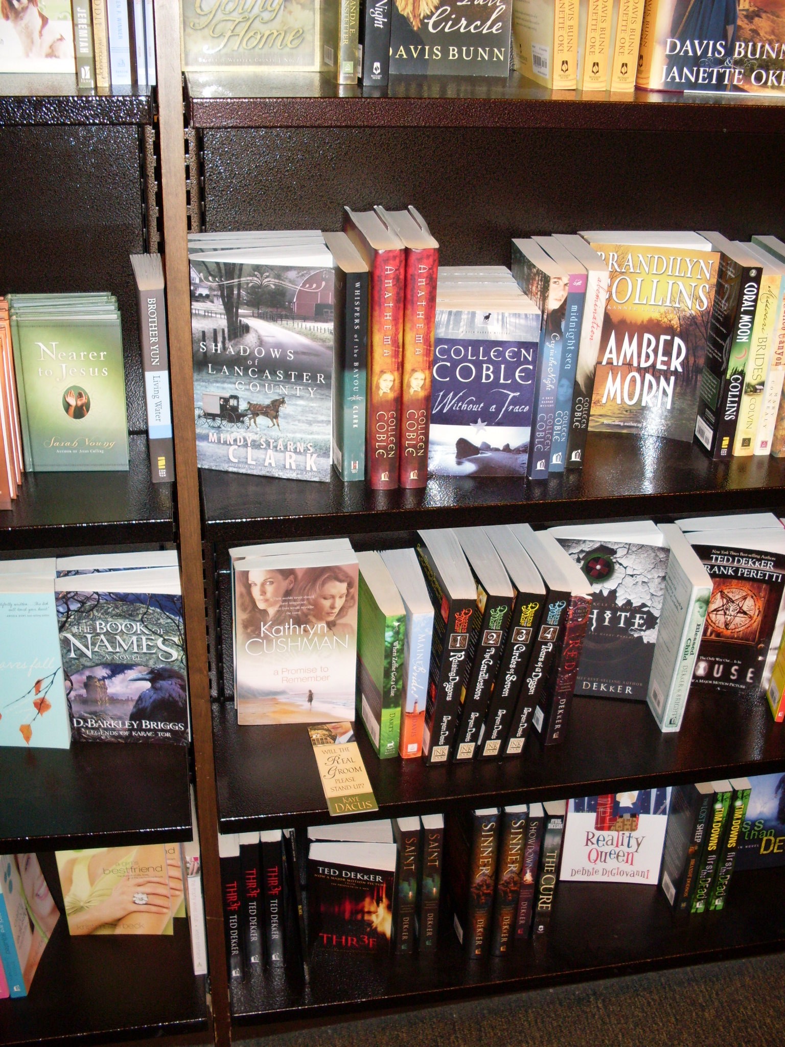 In heavier traffic than I saw down there on a Saturday two weeks before Christmas, I drove over to the Borders store. Their Christian fiction section is way back at the back of the store—right next to the restrooms. Oh, yay, what placement! But, I guess that means that there is actually more traffic past that shelf than past that section in B&N, where it’s buried between other sections on the other side of the store. But I digress. They did have two copies—with a hole that indicated that two or three copies had sold. So I faced-out one copy. Even though in this picture, I put it on top of the Kathryn Cushman books next door, there was enough room farther up the shelf that I was able to slide everything to the left enough that I was able to move my book face out beside Cushman’s. And I ended up moving the second copy onto a separate, small, free-standing shelf displaying copies of The Shack. Even though you can’t tell in this picture, the shelf my book is on is right at eye-level.