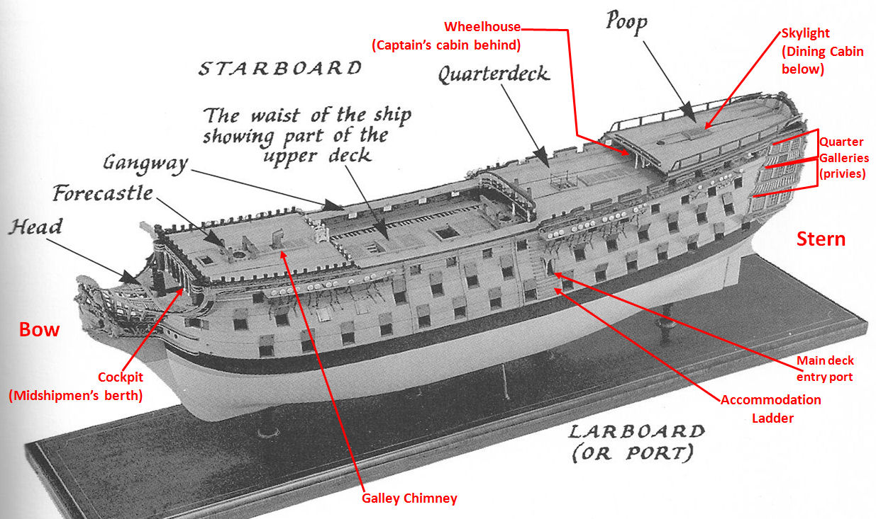 In this picture, you see a big, gaping hole in the middle of the ship (the “waist”)—this is where the ships boats were stowed until needed. At the BOW (front) of the ship, you’ll see I’ve added an arrow pointing to the Cockpit—or the Midshipmen’s berth, at either end of which you’ll see two semi-circular bump-outs known as the roundhouses. And at the STERN (back), I’ve bracketed the Quarter Galleries—ornamented sections with windows that bumped out at an angle at the side of the ship. (Here’s another image of the HMS Victory—which has a third deck the ships in RC don’t have—showing just how they hug the back end of the ship.)