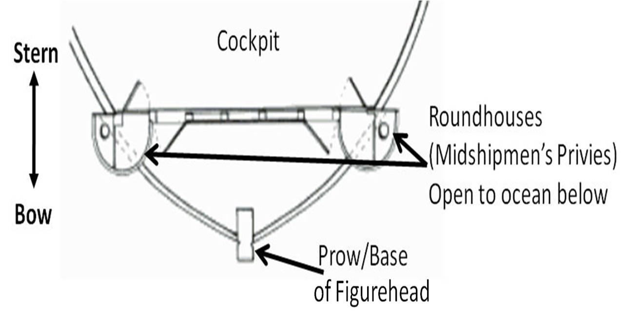 The ships had quarter galleries on both sides. The captain probably only had one set up as a privy and used the one on the other side for storage (he could also look forward through the windows and see the sails without having to leave his cabin—very nice in foul weather!). The lowest quarter gallery was open to the sea, while the upper galleries had discharge piping. As mentioned yesterday, in the wardroom, there were two quarter galleries—one for the first lieutenant’s private use, accessible only through his cabin, and one shared by the remainder of the wardroom officers.