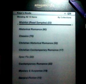 Same thing with e-book samples . . . except, of course, when I find one that I don’t enjoy reading, I don’t have to read it to the end—I can just delete the sample from my device and move on to the next one. Then, when I find one that does make me want to keep reading, since I probably won’t have money to purchase it immediately, it gets moved into the Wishlist collection until such a time as I do have a little disposable income and can make those purchases. (Or, with Christian fiction, until it goes up for free to promote the author’s newest release—yes, I must admit, I do take advantage of this—and that’s how far behind I am in keeping up with the Christian market! Though, now that I think about it, most of the Christian books I’ve downloaded free onto my Kindle recently are those I already have hard copies of on my shelves.)