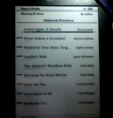 As you can see by the screen capture of my Kindle, I have 80 titles in my Historical Romance collection—of which at least 80% are samples—and only 23 in my Wishlist (Read Samples) collection. I read, on average, three or four samples a week; I’ve had the Kindle since February, which means I’ve read at least 100 samples since getting the device. So why only 23 titles on the wishlist?