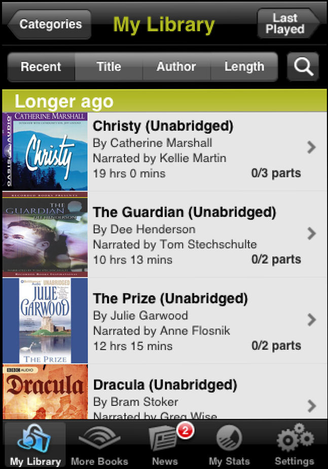 (I know, I know. I’m a traitor to the PC cause.) Because I’m not listening to the audiobooks driving to work every day (I only have a fifteen minute drive now, and it’s in pretty heavy traffic, so I’m better off with music), I’m listening to them primarily at home. And because my iPad will charge while plugged in, which my MP3 won’t, I’m less likely to have the device die on me. Plus it’s nice to be able to download instantly, instead of having to dig up the USB cord and sit at the computer to download an audiobook to the MP3.Is there a particular type of story (genre) you prefer listening to as an audio book?