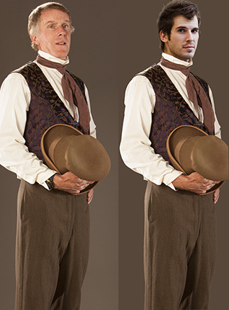 It usually takes numerous variations before the final composition is worked out. Then the heavy lifting in Photoshop begins. As you can see from the photos there was a lot of post production on these. You can see how huge the dress was on Jordan. I used my paster, Jeff Gwinn, for the men’s shoot knowing that I’d be switching out his head for the final. I’ve actually used him a number of times for this sort of thing. He likes to brag that he has the body of a young stud!
