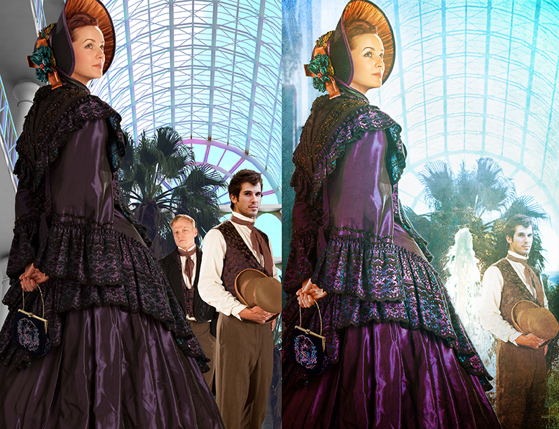 The challenge was to create a cover that immediately tells the viewer that this is a historical romance set somewhere in the mid-1800s. And if they’ve watched North and South, they’ll hopefully recognize the setting. Finding appropriate models and period clothing wasn’t too difficult, but placing them in the Crystal Palace, a building that no longer exists, was tricky.