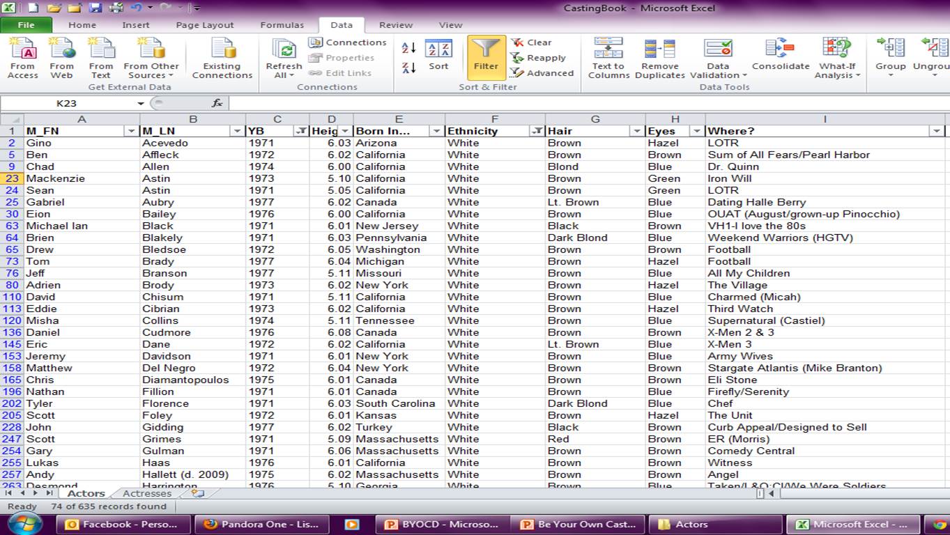 A screen shot of the Actresses page in my Casting Book, sorted by Last Name (click image to view full-size)