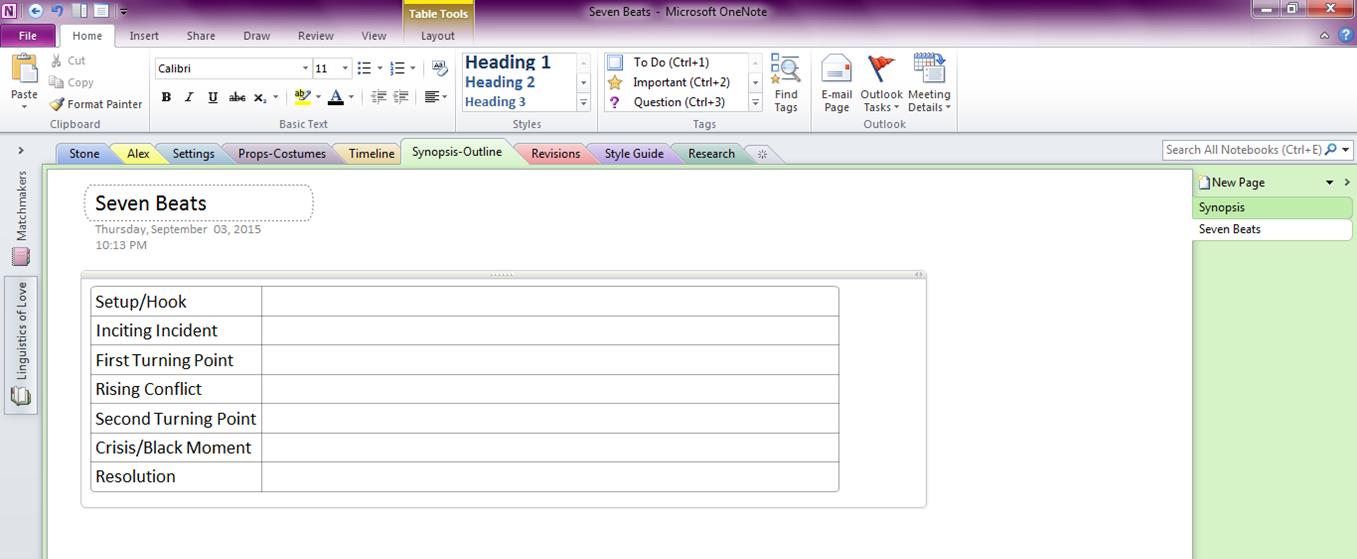 As you can see, I intend to use the Seven Beat structure for planning my story (working title: The Linguistics of Love—I’m not happy with it, but until I know more about the plot and themes of the story, that’s what I’m sticking with). Obviously, I haven’t filled anything in yet—because we’re not at that part of the process yet!