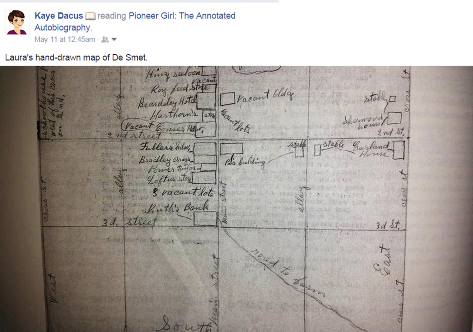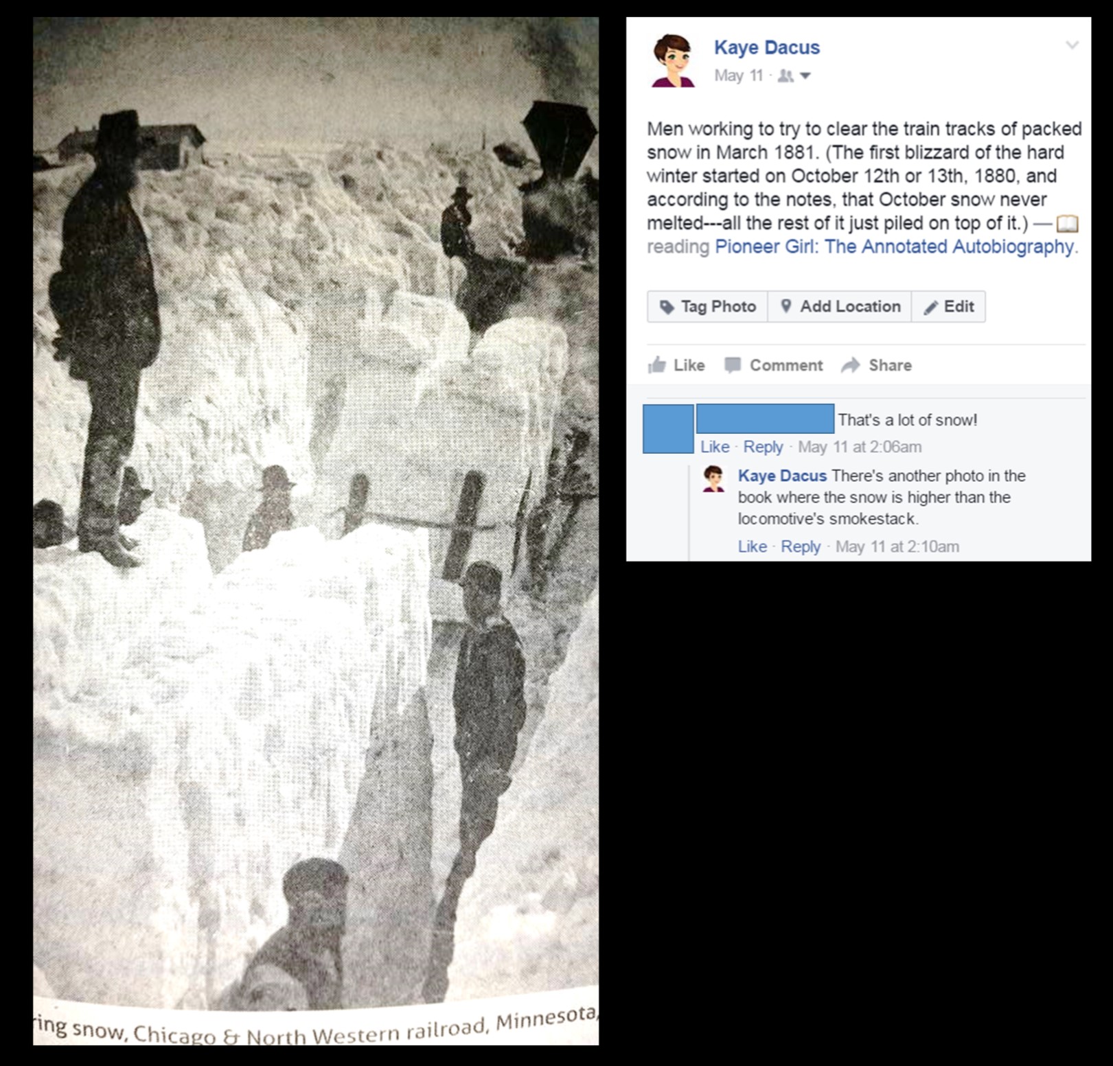 05/11 on page 227 of Pioneer Girl: (56.0%): Whew! The long winter is over—at least this version of it. In this memoir, LIW did not commit to nearly as much detail or description to remembering the hard winter as she did with any other section that became its own novel. It’s obvious, even without the annotations, that Laura really had a hard time writing about it.
