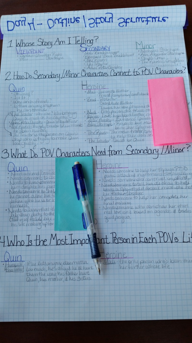 - List your Viewpoint, Secondary, and Minor characters. You might want to refer to last year’s post if you aren’t sure how to answer this question.