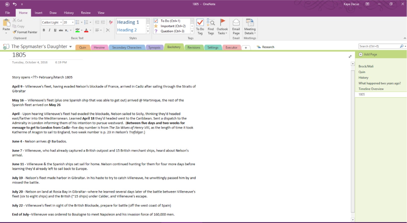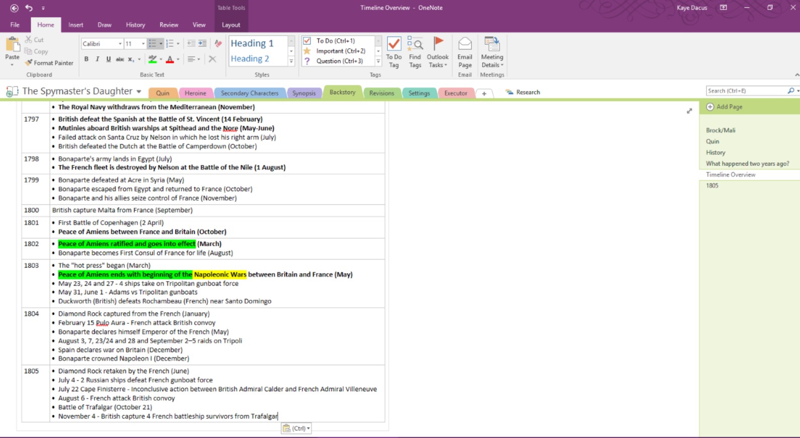 Now, back toward the beginning of this year, when I first started working on this story idea, I knew I wanted it set in the months leading up to the 1805 Battle of Trafalgar, one of the seminal Naval battles in the Napoleonic War. But all of the research that I did for the Ransome Trilogy was focused on 1814 and the short-lived peace after many, many years of war and before the final battle of Waterloo. A lot of things were different, not only for my characters, but also for the Royal Navy and for England herself in the nine years between these settings/events. So while I had a basic knowledge that the Battle of Trafalgar happened in October 1805, it was a surprising but decisive victory for Britain, and it’s the battle in which Admiral Horatio Nelson lost his life aboard HMS Victory, I didn’t really know much about what the immediate events were leading up to it or how those might work for my story. So, back then, I did this: