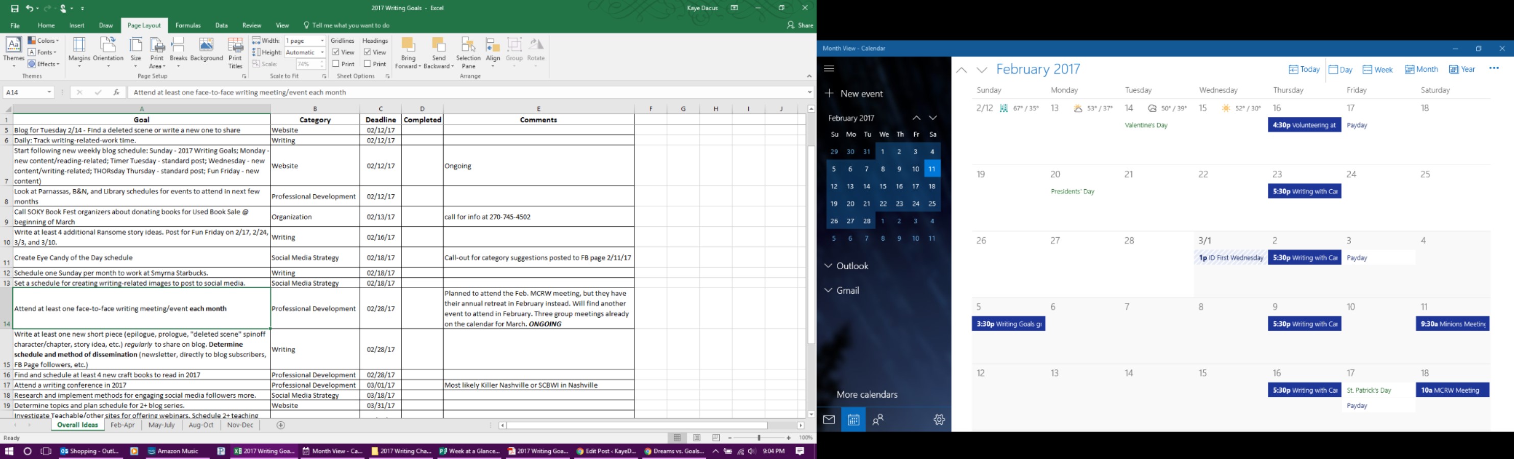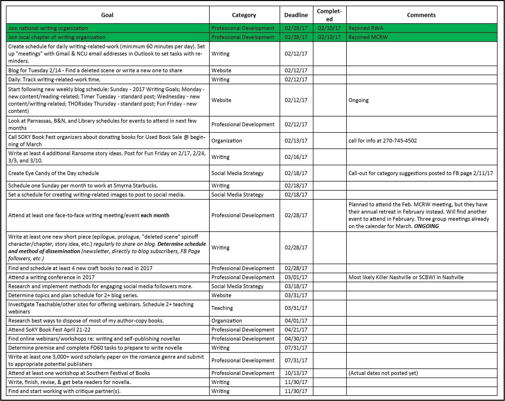I spent a little while last night, after putting everything into the spreadsheet, creating each as an individual (or recurring) task in Outlook. That way, as soon as I open my email in the evening, the first thing I see is my checklist of writing-related activities that need to be accomplished for the day!