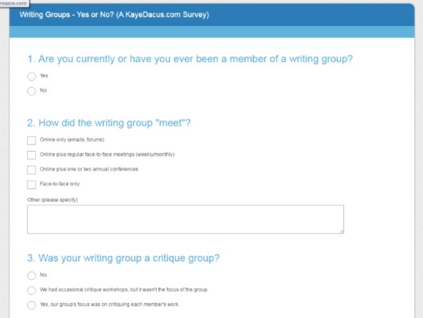 I’m doing a bit of research on writing groups—specifically on the thoughts, attitudes, and experiences of people who’ve been in writing groups. If you have a few minutes, please click the screen-capture image below to fill out a brief (9-question) survey about writing groups.