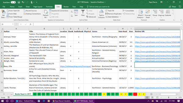“As I’ve done for the past several years, I’ve set this year’s goal by simply adding one to the previous year’s total. That puts me at a goal of 65 titles to be read in 2017 (an average of 5.4 titles per month). . . . my goal this year is to read at least two authors’ books for each letter of the alphabet. (X being optional, since it’s hard to come by authors with names starting with X, though I may extend it to first names just to get that one in.)”