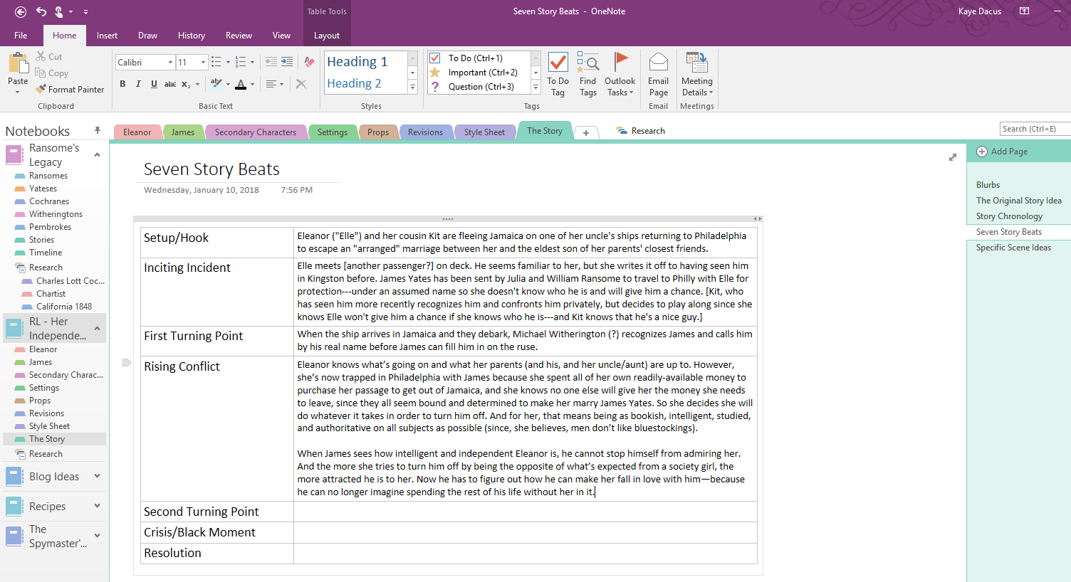 Here’s what I need to know about my story before I can set a timeline: I need to know some more specific details and scenes that will take place in the midsection of the book (Beats 4, 5, and 6) to know just how long it’s going to take for Elle to fall in love with James and agree to return to Jamaica and marry him. I can, however, go ahead and set up calendar pages in Word (with a link on the Story Chronology page in OneNote) for seven or eight months from mid-1843 to April 1844.