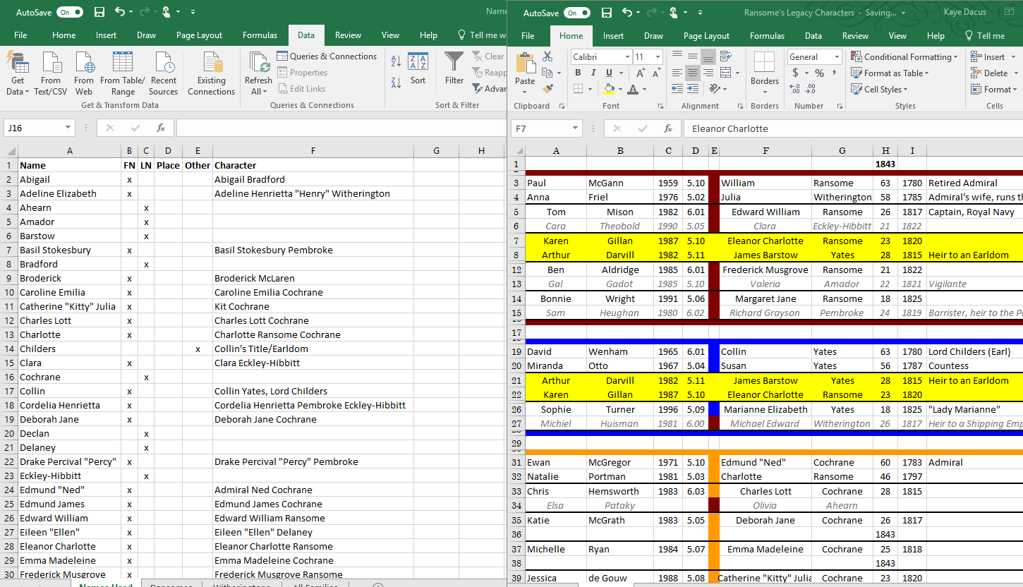 On the right is the original spreadsheet I made with the family groupings for the characters involved in the Ransome’s Legacy stories (at least the main families tied to the original Ransome Trilogy). On the left is the master list of names—first names, last names, place names, and “other” (for example, Childers which is Collin Yates’s earldom title—Lord Childers). [Yes, Adeline Elizabeth changed to Adeline Henrietta when I wrote out the idea for her story.]