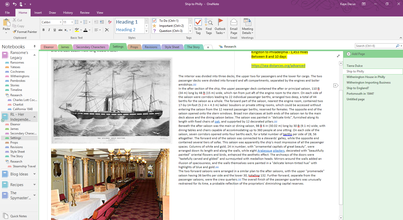 Because my setting is historical, just about any setting I use involves some measure of research. Tonight, that centered on Michael and Serena Witherington’s grand town house in Philadelphia and the sea steamer that will take Elle from Jamaica to Philly. Yes, I used a sea steamer in Follow the Heart and still have all of that research saved in my OneNote story bible for that book. But that takes place eight years after this . . . and technology for sea-going steam engines changed drastically in that time (from side paddle-wheels to screw propellers) which means the look and layout of the ships themselves changed drastically—as did their speed and reliability. Could I have used the 1851 info and just assumed no one else would know the difference? Sure. But I would know. And it would bother me, even if no one else caught on.