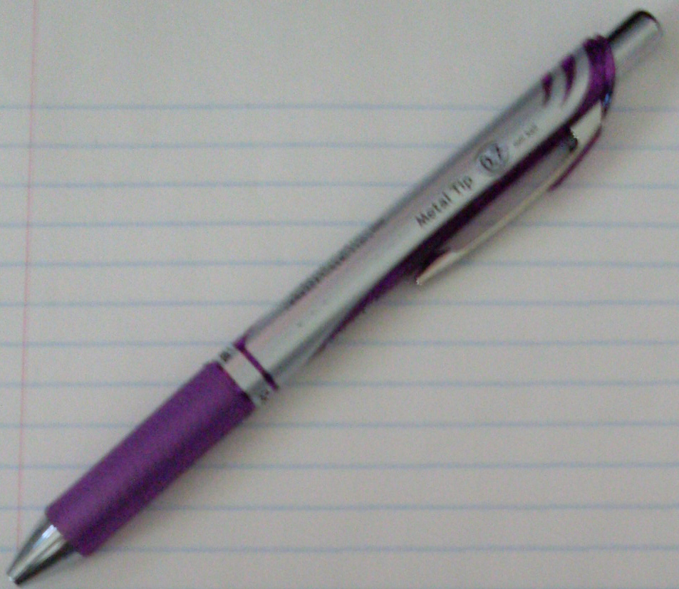 It’s a Pentel EnerGel Liquid Ink Gel pen with a 0.7mm tip—and purple ink, naturally. I took several of these with me on the trip and always carry one or two of them with me in my purse.