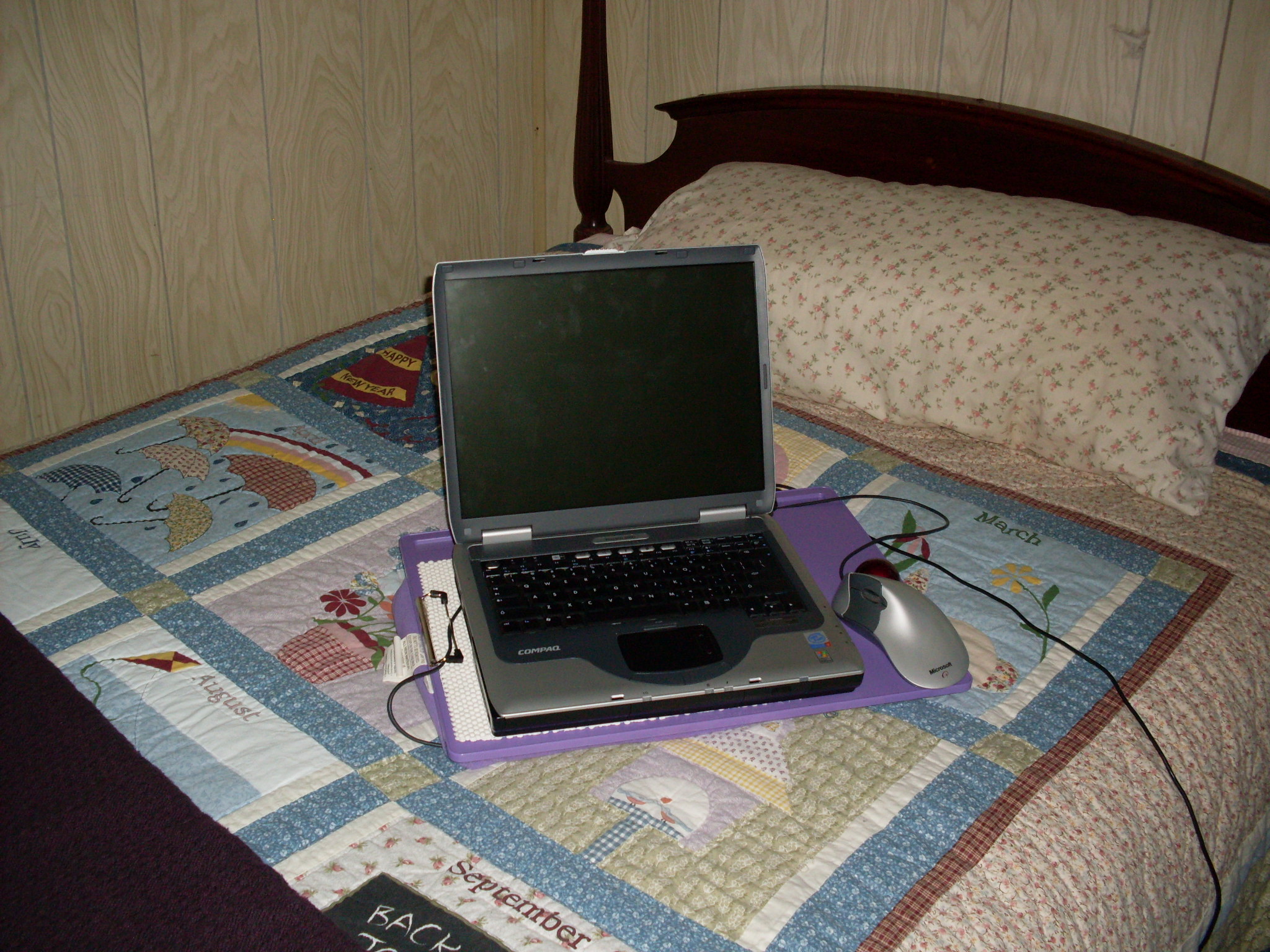 Because I’m a night person and because after dark is when I’m at my most creative/least distracted, sitting in bed with the laptop computer is when I’m most prolific at writing. And the lapdesk under the computer is one of the best investments I’ve ever made (picked it up at B&N—yes, probably would have paid less than $15 for it elsewhere, but it was purple and I couldn’t resist).