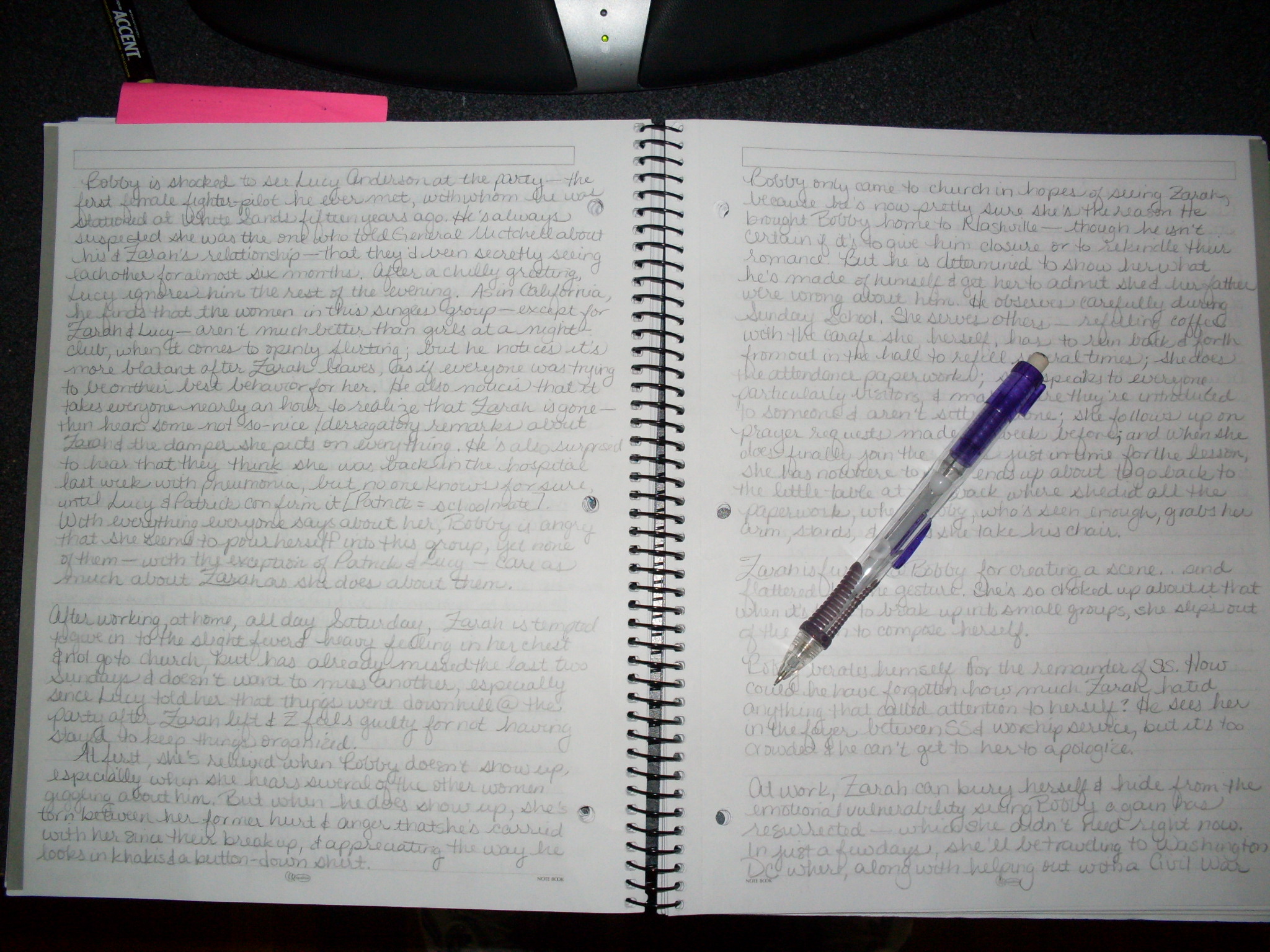 I may have mentioned here (but don’t specifically remember) that when I’m really needing to tap into my right brain and just let the words flow without unnecessary input from the left side of my brain (such as spelling, grammar, style, and structure), I write by hand. On the book tour, the girls had a good laugh at me whenever I would pull out my spiral notebook to get some writing done. . .