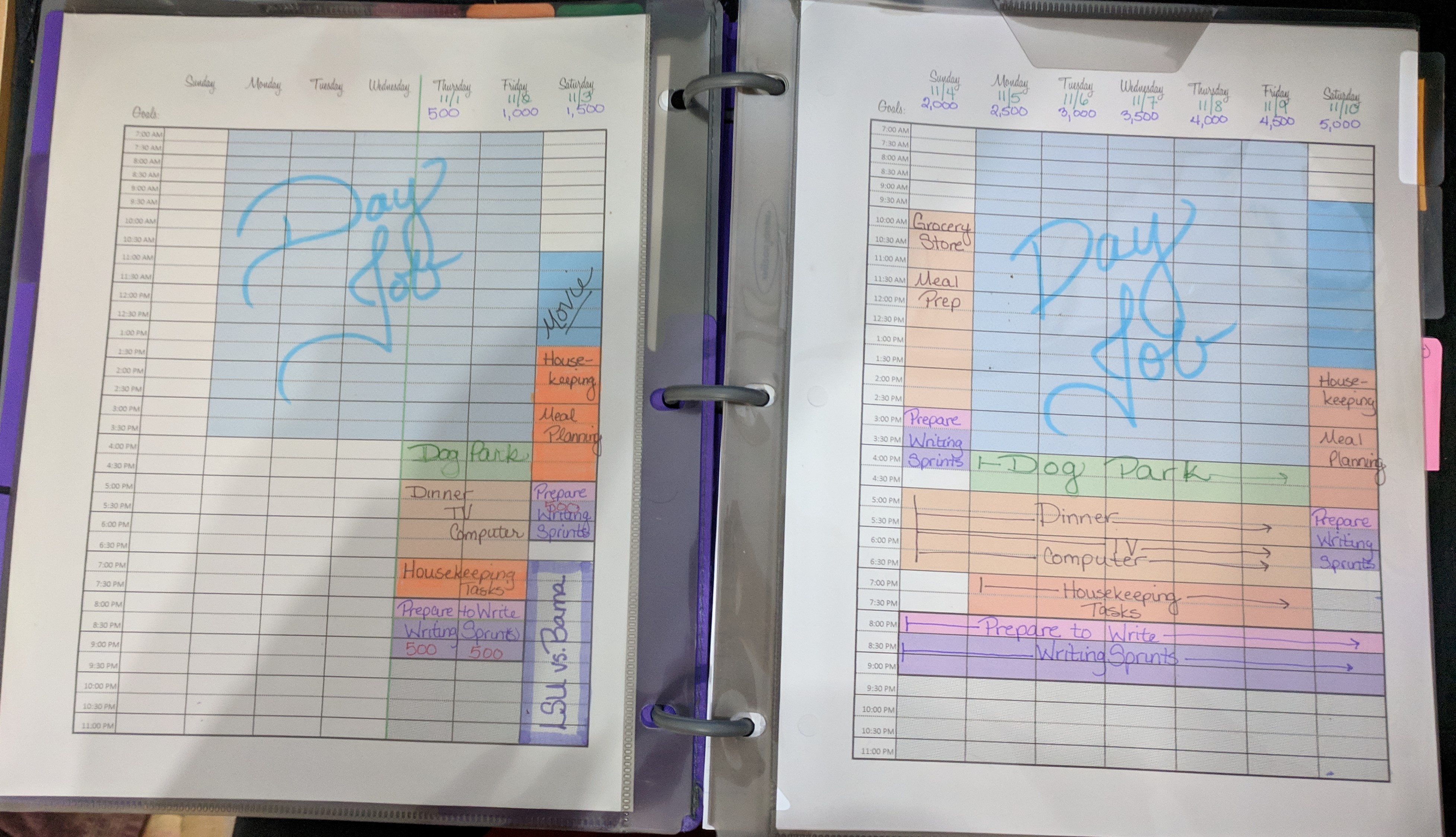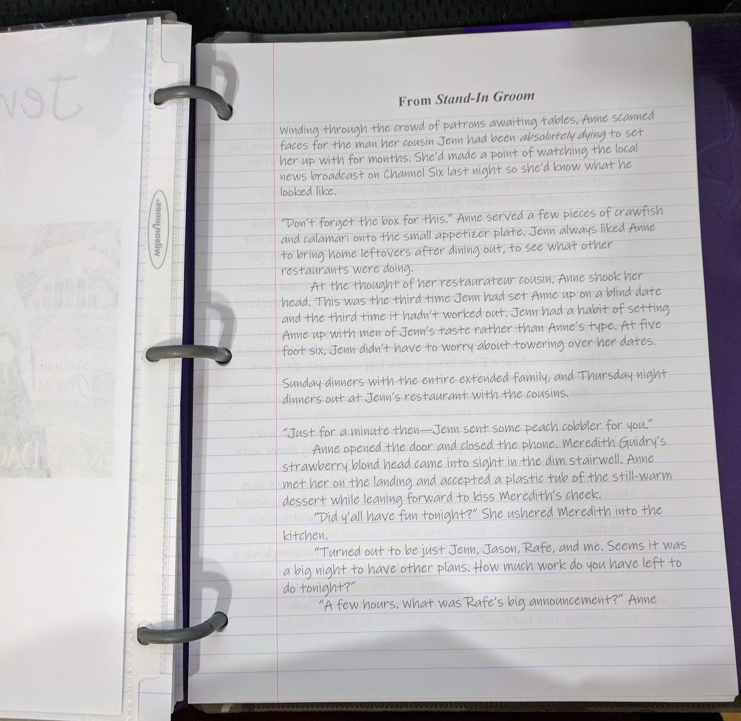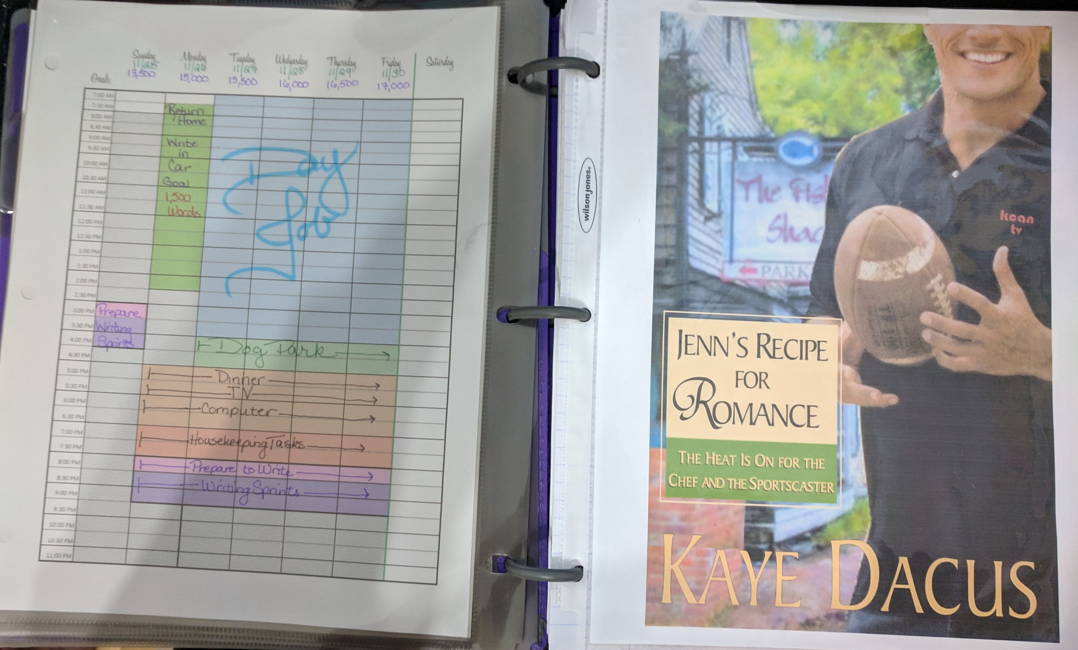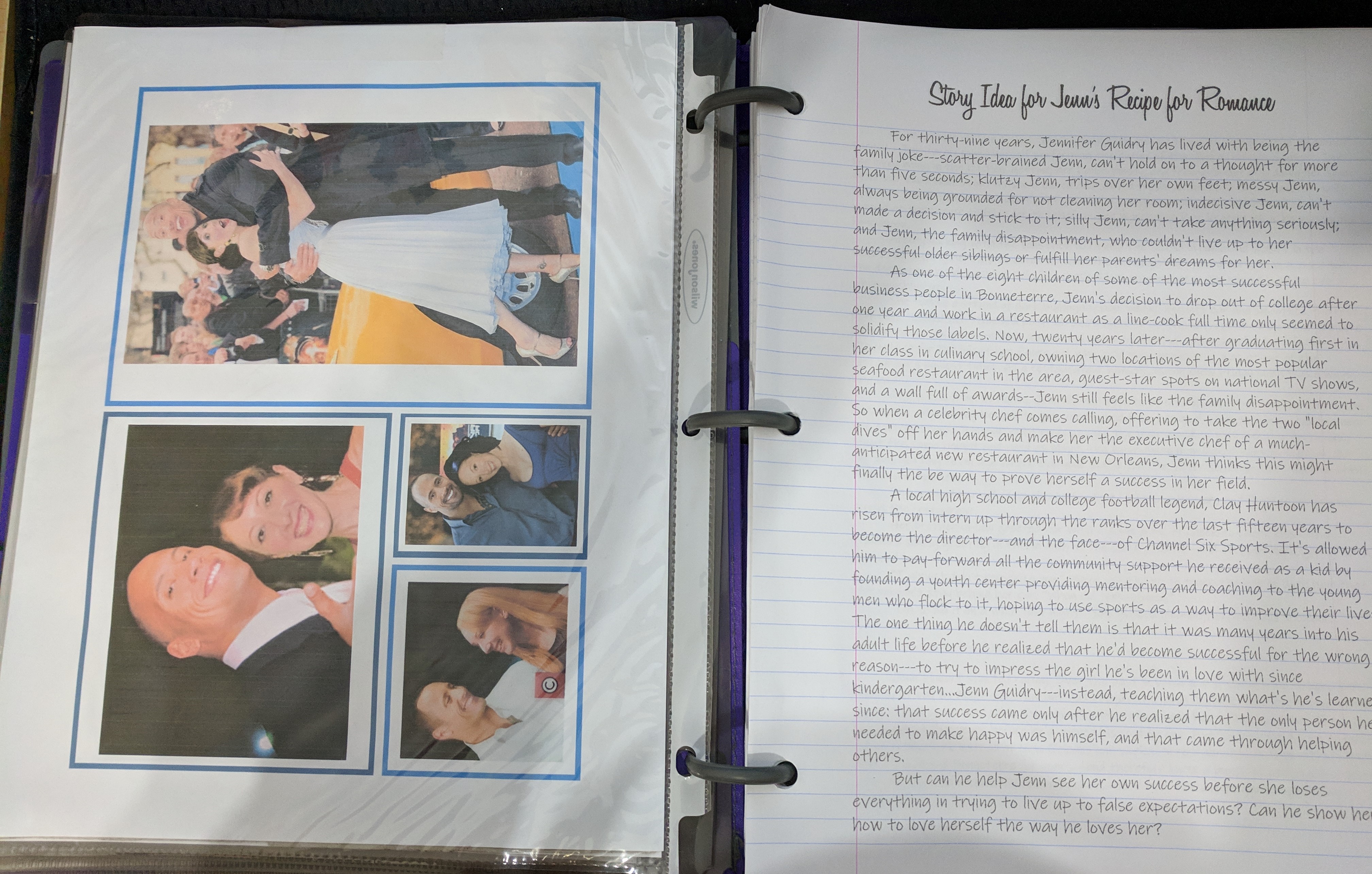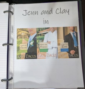 One of the first things I did was pull up the final manuscripts of the three previous novels in the Bonneterre series. I searched for Jenn’s and Clay’s names and copied/pasted the lines or scenes in which they were mentioned or appeared into a new document. I then printed everything I’d written last time I tried working on their story. I went back into the archived folder from back then and put together a couple of collages of ’shopped photos in which I put the two templates together and pulled up the fake book cover I created (I use Corel PaintShop Pro) and printed those. Then, I printed and filled in my calendars.
