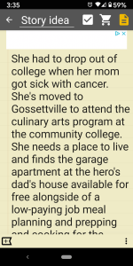 Unlike the other ideas I’ve jotted down over the past several years that fizzled, every day I’ve been eager to pick up the tablet and keep working on this one. Every day for almost two weeks! I’ve even been thinking about it and having ideas for the story or characters randomly throughout my days, and staying up way past my bedtime writing those ideas down—something that hasn’t happened to me in close to a decade!