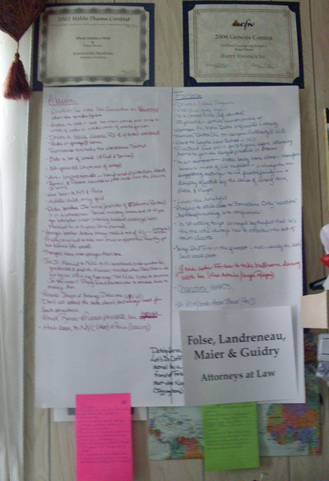 All but two of my eleven published novels were sold based on synopses and proposals, and those synopses varied from detailed to somewhat vague. But once I started writing, I got caught up in the minutia of the characters and the dialogue and the setting and sometimes lost sight of where the story was supposed to be going—and forgetting some of the scenes I’d had ideas for when I first wrote the synopsis. Which usually brings my momentum to a screeching halt and means it can be days or even weeks on end without producing meaningful word count.